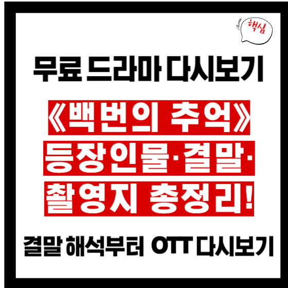 이번 포스팅에서는 ‘백번의 추억’ 재방송을 보고 싶어하는 분들을 위한 OTT 다시보기 정보, 실제 드라마에 등장한 촬영지, 그리고 드라마의 원작 여부까지 총정리해보았습니다. 또한, 편성표, 시청률, 그리고 즐길 거리까지 빠짐없이 정리했으니, 마지막 회까지 놓치지 않고 보고 싶은 분들께 유익한 정보가 되길 바랍니다.