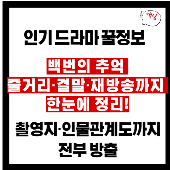 감성을 자극하는 감동 드라마 **'백번의 추억'**이 최근 다시 주목받고 있습니다. 백번의 추억 줄거리, 등장인물, 그리고 결말까지 궁금해하는 시청자들이 많아지면서, 몇부작 구성인지, 편성표는 어떻게 되는지 찾는 분들도 늘고 있는데요. 특히 실제 촬영지와 드라마 속 즐겨 찾는 장소까지 관심을 모으고 있습니다.