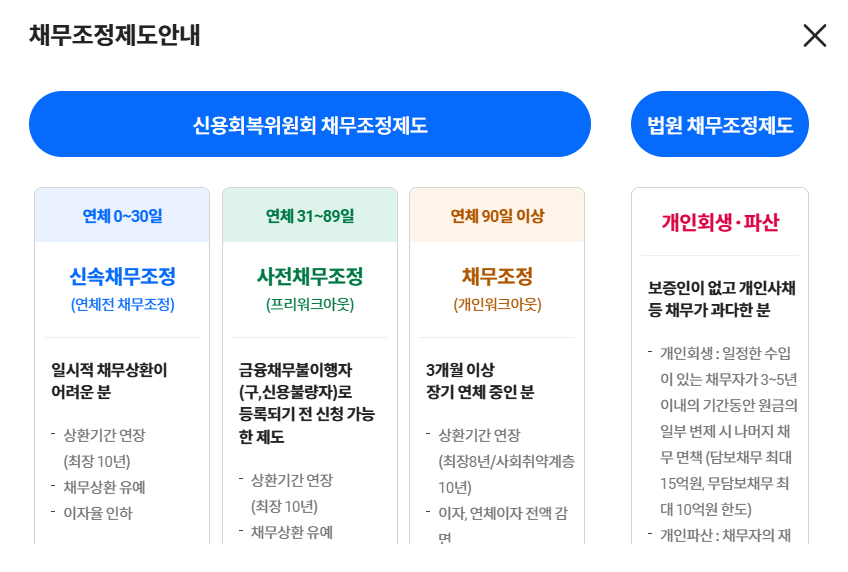 개인워크아웃 | 연체 장기화 | 원금 일부 감면 + 신용회복 지원 |