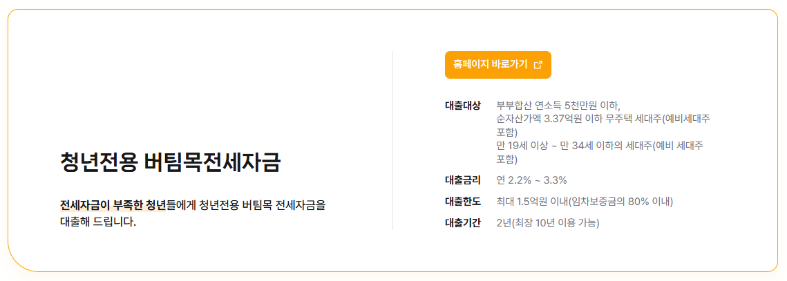 | 청년 버팀목전세대출 | 연 1.8% ~ 2.7% | 저금리, 변동 가능 |