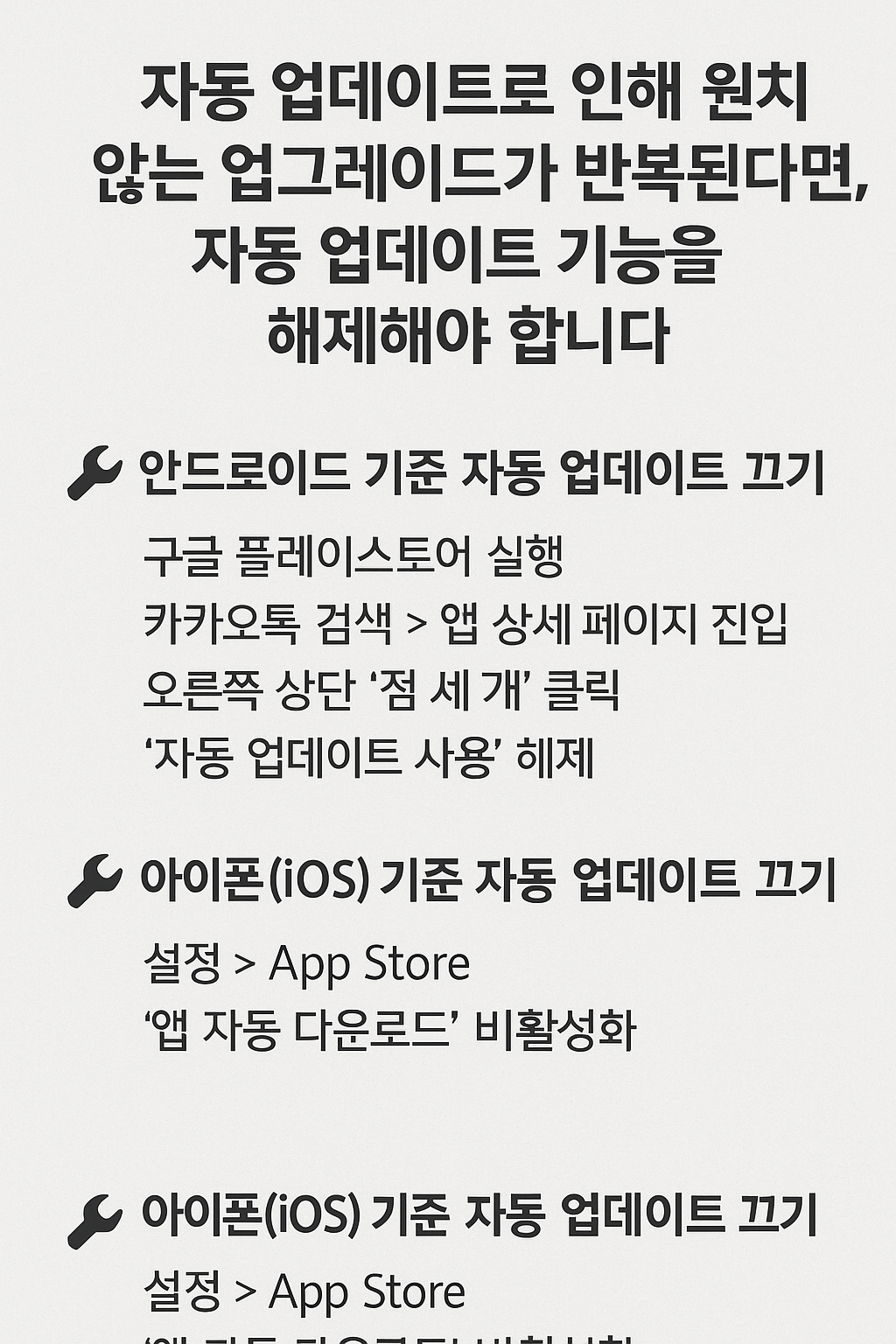 카카오톡은 앱스토어나 구글 플레이스토어에서 자동으로 업데이트되는 구조라, ‘업데이트 취소’ 기능은 공식적으로 제공되지 않습니다. 하지만 아래와 같은 방법으로 **원상복구(구버전 설치)**는 가능합니다.