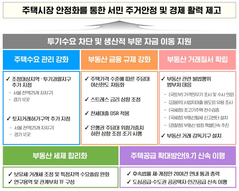 특히 실수요자와 투자자 모두에게 영향을 주는 주택구입자금 대출 기준 조정, 재건축·재개발 투자에 대한 제한 강화, 토지거래허가구역 확대, 갭투자 차단은 자산 이동 전략을 전면 수정해야 하는 수준입니다.