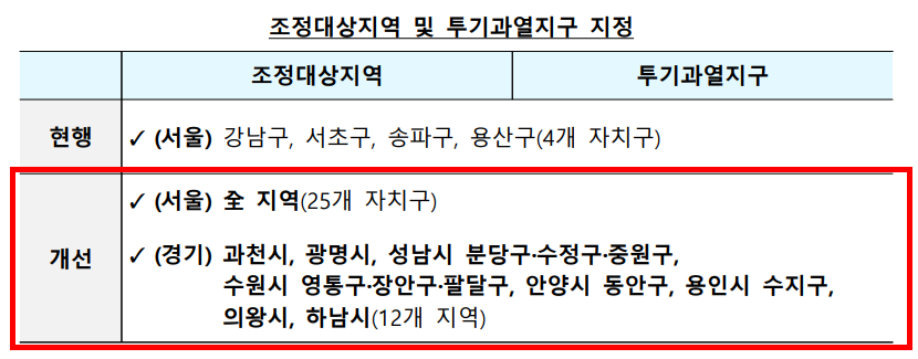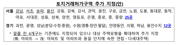또한 경기도 과천·광명·성남 분당·안양 동안구·하남·군포·구리 등 12개 지역도 신규 지정되며, 향후 추가 지정 가능성도 제기되고 있습니다.