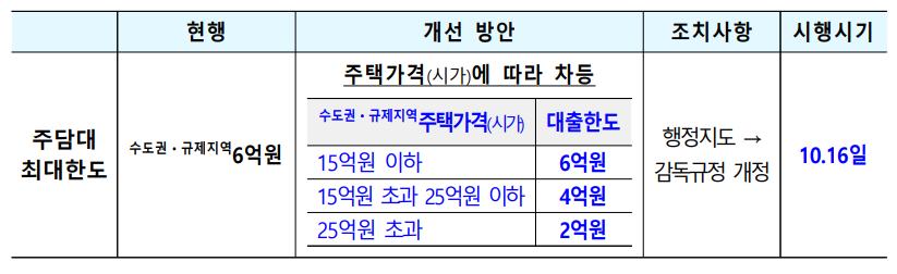 이번 대책 중 가장 큰 변화는 주택담보대출 한도 차등 적용입니다.